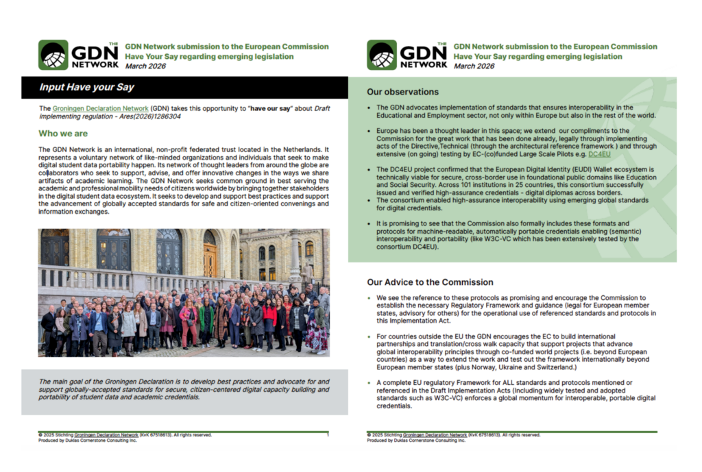 - Consult an expert panel of GDN members and experts in technology, data privacy, and international credential exchange to understand the current and planned efforts to promote interoperability of digital credentials (by April 2023);